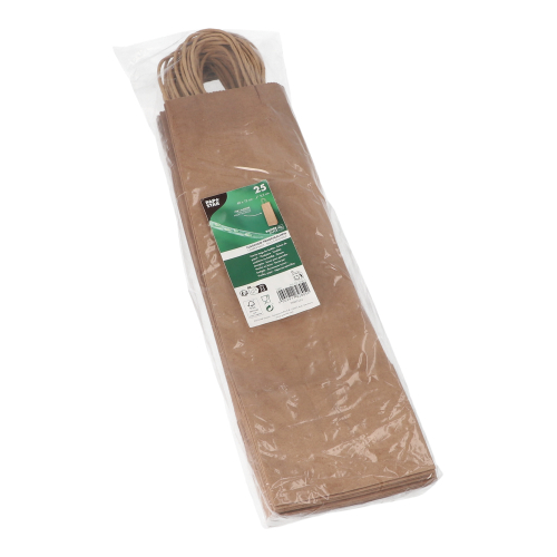Deze set van 25 bruine papieren flessendraagtassen met gedraaid handvat meet 40x12x9,5 cm en biedt een stevige draagoplossing. Het natuurlijke papier geeft een milieuvriendelijke uitstraling, perfect voor winkels of geschenken. Handig en stijlvol voor elke gelegenheid.