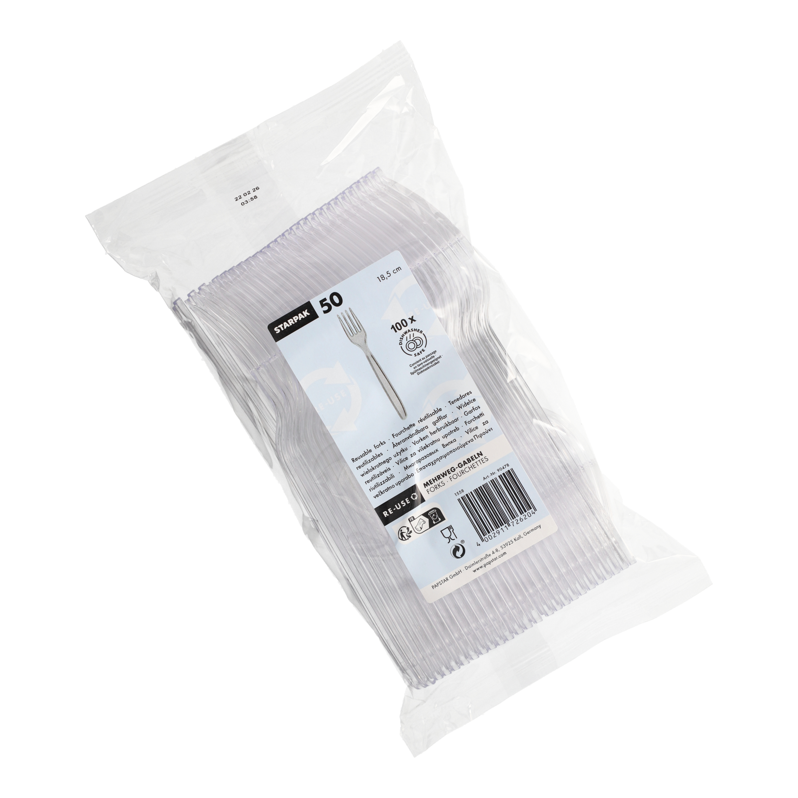 Deze transparante herbruikbare vorken zijn duurzaam en stijlvol, perfect voor feesten of catering. Met een lengte van 18,5 cm zijn ze comfortabel in gebruik en gemakkelijk schoon te maken. Een set van 50 stuks die bijdraagt aan minder wegwerpplastic.