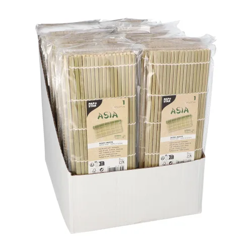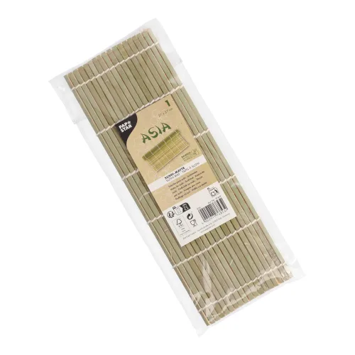 Deze groene sushimat van bamboo – in het Japans Makisu – wordt gebruikt om sushi te rollen. De grote afmeting van 27 x 27 cm biedt voldoende controle om maki en andere sushi-varianten strak en precies te rollen. De stevige platte bamboe-stokjes houden alle ingedriënten – nori, sushirijst, verse groente en vis – keurig vast en garanderen een perfect product – de groene kleur onderstreept de versheid van het product.